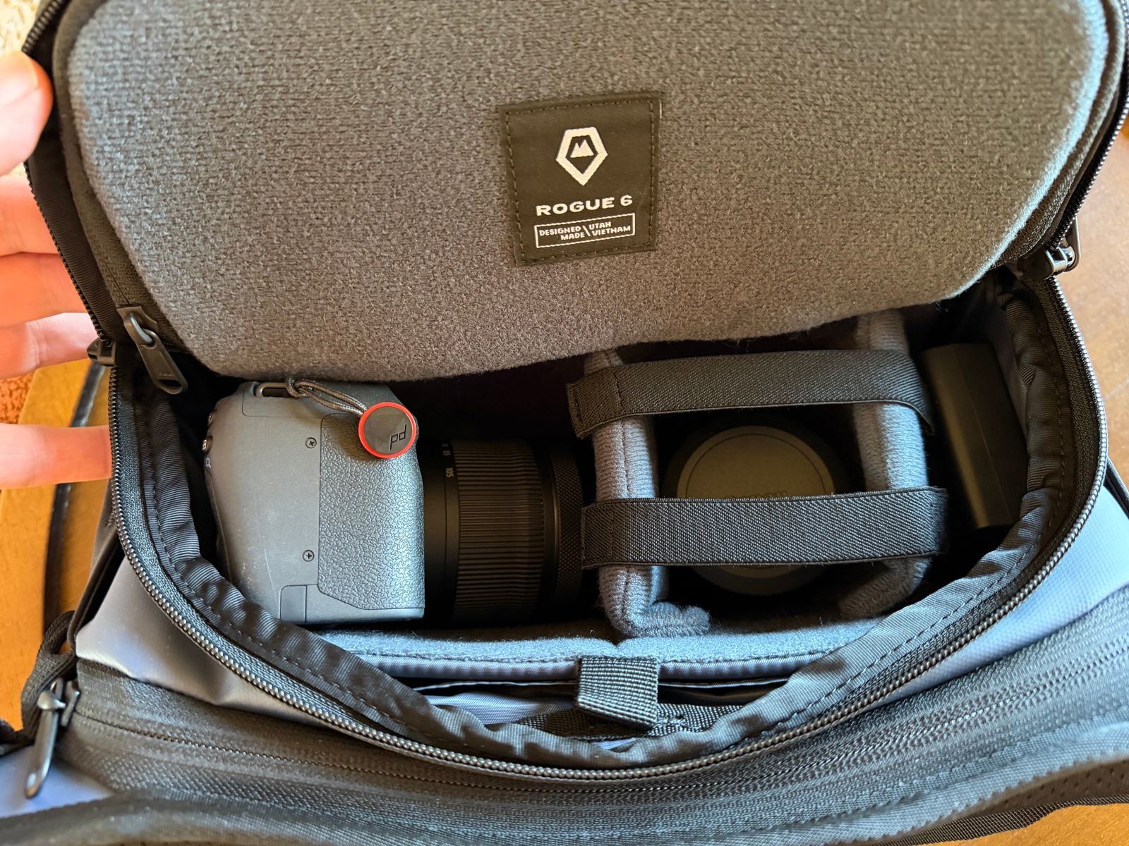 This bag is great for my Canon RP with the 24-105 f4-7.1 lens on it and the 50mm f1.8 on the side. There is plenty of room for my extra battery, SD cards, cable, caps and other accessories. I haven't used it on any long walks or hikes yet but it seems very comfortable and should be good for day out. I started with the ROGUE 4L size and it was a bit too small so I'm glad I went up to the 6L size.