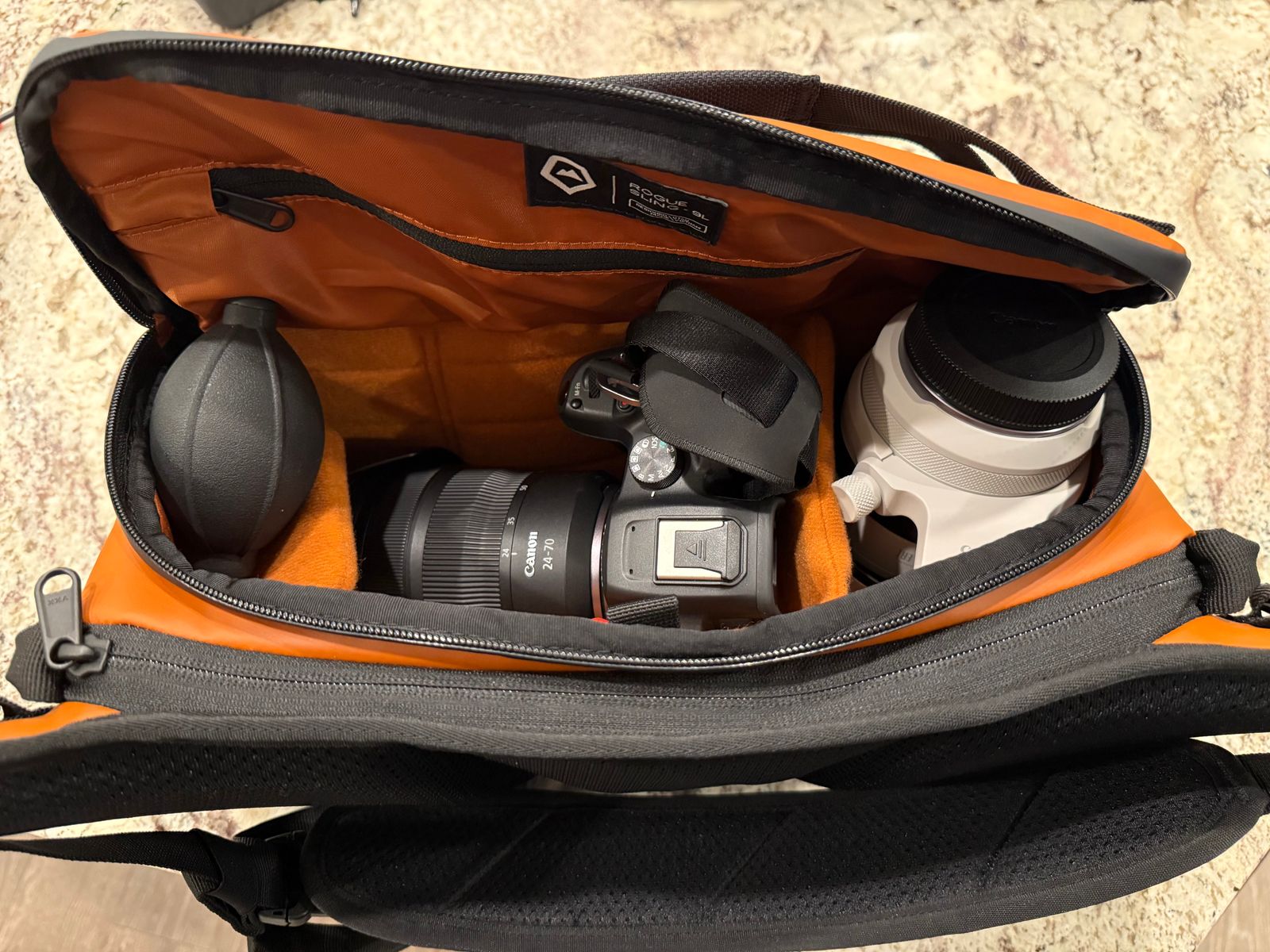 This sling (v1 9L) is great for what I need. Have two young kids in soccer, basketball, softball (all the sports - we hike and bike) and I’m able to fit my Canon R7 with 24-70 lens (attached to body) and 70-200) with room to spare in the main compartment. I use one of the dividers as a shelf to hold cleaning equipment and with Peak Design clutch grip/handle it’s an amazing setup for fast, on the go, outdoor photography. Front pocket is great for SD cards, spare battery, ND filter, phone/wallet. Room to spare as well in the 9L. Able to carry my Peak Design travel tripod at the bottom, so the front webbing and laptop sleeve aren’t even used - room to spare.
