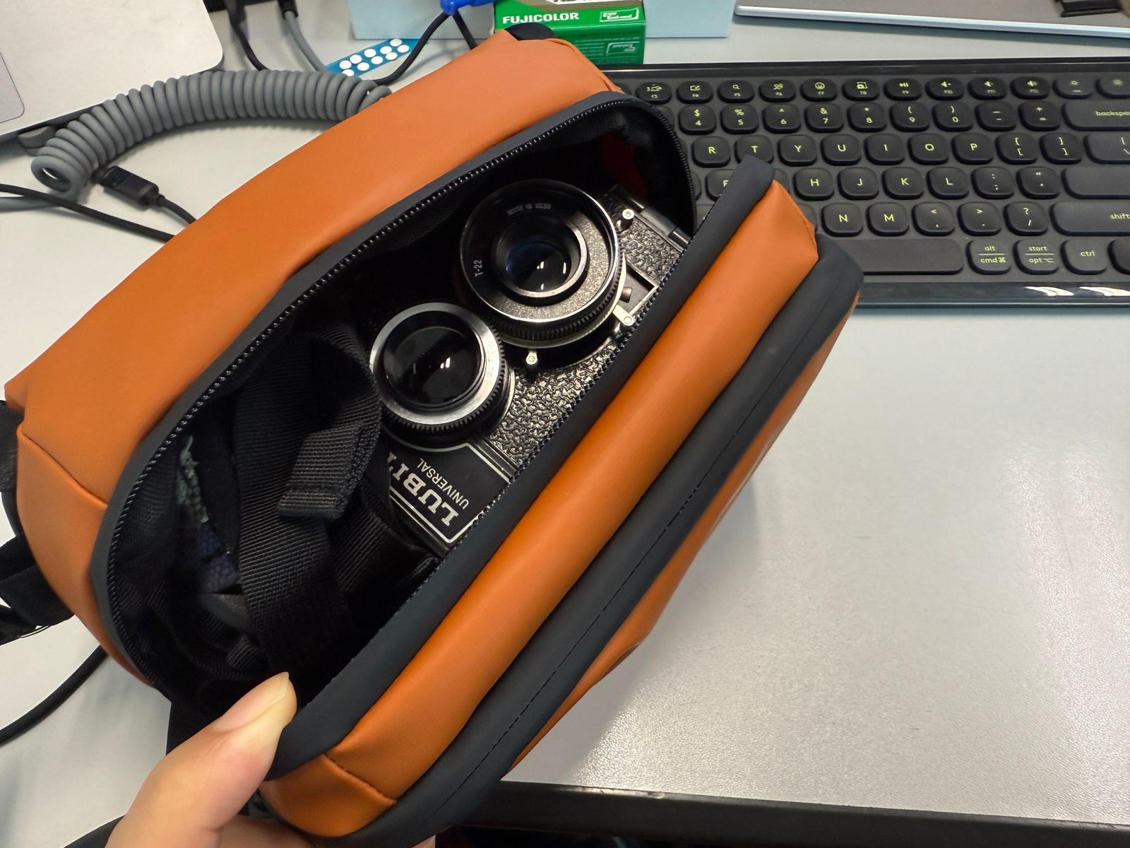 This stylish orange camera bag is perfect! Great protection, looks cute, and fits the vintage Lubitel camera snugly. Highly recommend!